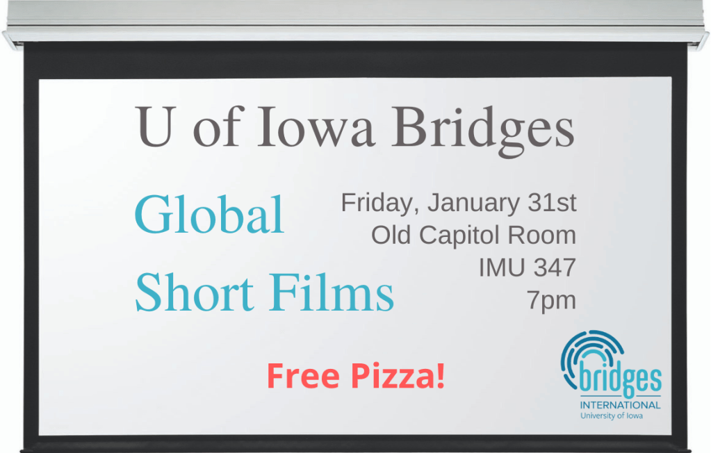 You’re invited to join U of Iowa Bridges this Friday, January 31st at 7pm for Global Short Films! We’ll watch two short videos (around 5 minutes) and discuss them together.