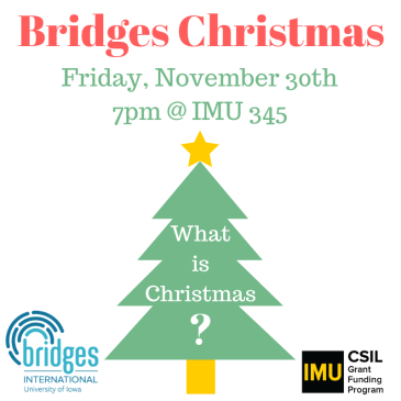 You’re invited to join us for Bridges Christmas this Friday, December 6th at 6pm. We’ll be at the Latino-Native American Cultural Center (directions below). We will have a variety of snacks, fun games to play and get to hear about the meaning behind Christmas! You won’t want to miss it! Even better, it’s all FREE! … More Bridges Christmas